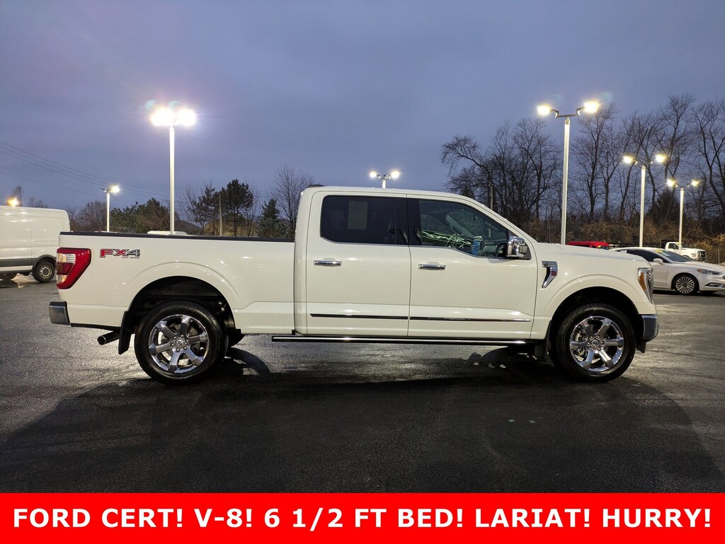 Clean CARFAX. Lariat ***Ford Blue Advantage GOLD Certified Pre-Owned!!***, ***GREAT VALUE HERE! ALL FORD GOLD CPO WARRANTY AND BENEFITS INCLUDED IN THE PRICE!!***, USB PORTS!, REARVIEW CAMERA!, BLUETOOTH!, GREAT VEHICLE HISTORY!, ONE OWNER CLEAN CARFAX, CLEAN CARFAX, ONE OWNER, HARD TO FIND 6.5 FT. BOX & 5.0L V-8 POWER TOO!, 5.0L V8, 4WD, 2nd Row Heated Seats, 4-Wheel Disc Brakes, 4x4 FX4 Off-Road Bodyside Decal, 8 Speakers, ABS brakes, Adjustable pedals, Air Conditioning, AM/FM radio: SiriusXM with 360L, Auto High-beam Headlights, Auto-dimming door mirrors, Auto-dimming Rear-View mirror, Automatic temperature control, Bed Utility Package, BoxLink, Brake assist, Bumpers: chrome, Class IV Trailer Hitch Receiver, Compass, Connected Built-In Navigation, Driver door bin, Driver vanity mirror, Dual front impact airbags, Dual front side impact airbags, Electronic Locking w/3.31 Axle Ratio, Electronic Stability Control, Emergency communication system: SYNC 4 911 Assist, Equipment Group 502A High, Evasive Steering Assist, Extended Range 36 Gallon Fuel Tank, Exterior Parking Camera Rear, Ford Co-Pilot360 Assist 2.0, Front anti-roll bar, Front Bucket Seats, Front Center Armrest, Front dual zone A/C, Front fog lights, Front License Plate Bracket, Front reading lights, Front wheel independent suspension, Fully automatic headlights, FX4 Off-Road Package, Garage door transmitter, Hard Folding Tonneau Pickup Box Cover, Heated door mirrors, Heated front seats, Heated steering wheel, Hill Descent Control, Illuminated entry, Intelligent Adaptive Cruise Control w/Stop & Go, Intersection Assist, Leather-Trimmed Bucket Seats, LED Box Lighting, LED Projector w/Dynamic Bending Headlamps, Low tire pressure warning, Memory seat, Monotube Rear Shocks, Navigation System, Navigation system: Connected Navigation, Occupant sensing airbag, Off-Road Tuned Front Shock Absorbers, Outside temperature display, Overhead airbag, Overhead console, Panic alarm, Partitioned Lockable Fold-Flat Storage, Passenger door bin, Passenger vanity mirror, Pedal memory, Power door mirrors, Power driver seat, Power passenger seat, Power steering, Power Tailgate, Power Tilt/Telescoping Steering Column w/Memory, Power windows, Power-Deployable Running Boards, Radio data system, Radio: B&O Sound System by Bang & Olufsen, Rain-Sensing Wipers, Rear reading lights, Rear seat center armrest, Rear window defroster, Remote keyless entry, Rock Crawl Mode, Security system, Speed control, Speed Sign Recognition, Speed-sensing steering, Split folding rear seat, Steering Wheel Heat Removal (DISC), Steering wheel mounted audio controls, SYNC 4 w/Enhanced Voice Recognition, Tachometer, Tailgate Step w/Tailgate Work Surface, Telescoping steering wheel, Tilt steering wheel, Tough Bed Spray-In Bedliner, Traction control, Tray Style Floor Liner (47W), Trip computer, Turn signal indicator mirrors, Twin Panel Moonroof, Variably intermittent wipers, Ventilated front seats, Voltmeter, Wheel Well Liner, Wheels: 20" Chrome-Like PVD, Wireless Charging Pad. Certified. Ford Gold Certified Details: