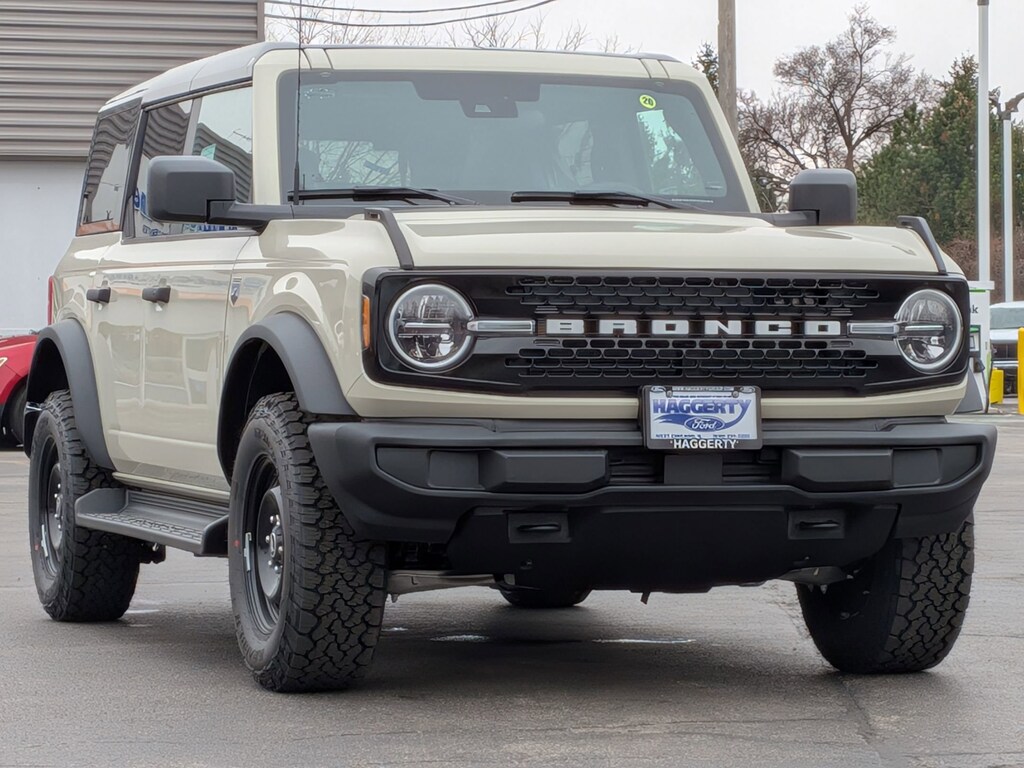 - "ENGINE: 2.3L ECOBOOST I-4,TRANSMISSION: 10-SPEED AUTOMATIC,EQUIPMENT GROUP 222A MID PACKAGE,DESERT SAND,FRONT LICENSE PLATE BRACKET,SIDE STEP,SHADOW BLACK PAINTED HARD TOP,BLACK APPEARANCE PACKAGE,WHEEL LOCK KIT,BRONCO 66 32"" SPARE TIRE COVER",SHADOW BLACK PAINTED HARD TOP -inc: Hard Top Sound Deadening Headliner Rear-Window Defroster & Washer,DESERT SAND,FRONT LICENSE PLATE BRACKET -inc: Standard in states requiring 2 license plates and optional to all others,EQUIPMENT GROUP 222A MID PACKAGE -inc: Rear Parking Sensors Pro Power Onboard - 400W Back side of center floor console Dual Smart Charging USB Ports Front Row Heated Seats Dr & Pass Illuminated Sliding Visor Vanity Mirrors Dual-Zone Electronic Automatic Temperature Control air conditioning Ford Co-Pilot360 Auto High-Beam Headlamps Pre-Collision Assist w/Automatic Emergency Braking pedestrian detection forward collision warning and dynamic brake support Blind Spot Information System (BLIS) Cross-Traffic Alert Rear View Camera backup assist grid lines Lane-Keeping System Lane-Keeping Alert Lane-Keeping Aid and Driver Alert Connected Navigation Ford connectivity package pinch-to-zoom capability live traffic predictive destinations and route guidance and One Box search Ambient Footwell Lighting 2-Door Intelligent Access w/Lock/Unlock Intelligent Access will also lock/unlock the swing gate,SIDE STEP,TRANSMISSION: 10-SPEED AUTOMATIC -inc: trail control and trail turn assist 3.73 Axle Ratio,BLACK APPEARANCE PACKAGE -inc: black appearance graphics package Black-Painted Molded-In-Color Grille white BRONCO lettering Black Molded-In-Color Fender Flares Black Molded-In-Color Sideview Mirror Caps Black Molded-In-Color Door Handles,ENGINE: 2.3L ECOBOOST I-4 (STD),Turbocharged,Four Wheel Drive,Power Steering,ABS,4-Wheel Disc Brakes,Brake Assist,Aluminum Wheels,Tires - Front All-Terrain,Tires - Rear All-Terrain,Conventional Spare Tire,Tire Pressure Monitor,Conventional Spare Tire,Tow Hooks,Tow Hooks,Heated Mirrors,Power Mirror(s),Intermittent Wipers,Variable Speed Intermittent Wipers,Privacy Glass,Rollover Protection Bars,Convertible Soft Top,Power Door Locks,Daytime Running Lights,Automatic Headlights,LED Headlights,Automatic Highbeams,AM/FM Stereo,MP3 Capability,Steering Wheel Audio Controls,Satellite Radio,Requires Subscription,MP3 Capability,Bluetooth Connection,Telematics,Auxiliary Audio Input,WiFi Hotspot,Smart Device Integration,Requires Subscription,Bluetooth Connection,Pass-Through Rear Seat,Rear Bench Seat,Adjustable Steering Wheel,Trip Computer,Power Windows,Leather Steering Wheel,Keyless Start,Keyless Entry,Power Door Locks,Cruise Control,A/C,Cloth Seats,Bucket Seats,Driver Vanity Mirror,Passenger Vanity Mirror,Smart Device Integration,Requires Subscription,Smart Device Integration,WiFi Hotspot,Power Windows,Power Door Locks,Trip Computer,Security System,Immobilizer,Traction Control,Stability Control,Traction Control,Front Side Air Bag,Telematics,Requires Subscription,Front Collision Mitigation,Tire Pressure Monitor,Driver Air Bag,Passenger Air Bag,Front Head Air Bag,Rear Head Air Bag,Passenger Air Bag Sensor,Driver Restriction Features,Child Safety Locks,Back-Up Camera