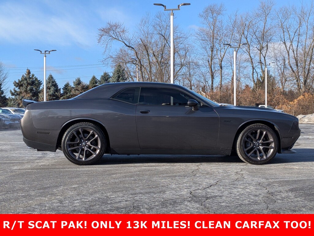 R/T Scat Pack CLEAN CARFAX, SRT HEMI 6.4L V8 MDS, 4-Wheel Disc Brakes, 6 Speakers, ABS brakes, AM/FM radio: SiriusXM, Anti-whiplash front head restraints, Apple CarPlay/Android Auto, Auto-dimming Rear-View mirror, Automatic temperature control, Brake assist, Compass, Compass Gauge, Dual front impact airbags, Dual front side impact airbags, Electronic Stability Control, Emergency communication system: SiriusXM Guardian, Four wheel independent suspension, Front anti-roll bar, Front dual zone A/C, Front fog lights, Fully automatic headlights, Garage door transmitter, GPS Antenna Input, Heated door mirrors, Heated steering wheel, Low tire pressure warning, Media Hub (2 USB, AUX), Outside temperature display, Overhead airbag, Overhead console, Panic alarm, Passenger vanity mirror, Power driver seat, Power windows, Quick Order Package 24G R/T Scat Pack, Radio data system, Radio: Uconnect 4C w/8.4" Display, Rear anti-roll bar, Rear window defroster, Remote keyless entry, Scat Pack Logo Houndstooth Seat, Security system, SiriusXM Satellite Radio, Speed control, Speed-sensing steering, Spoiler, Steering wheel mounted audio controls, Tachometer, Telescoping steering wheel, Tilt steering wheel, Traction control, Trip computer, USB Host Flip, Variably intermittent wipers, Wheels: 20" x 9.0" Lo Gloss Granite Crystal. Serving the communities of West Chicago, Winfield, Wheaton, Naperville, St. Charles, Batavia, Geneva, Aurora, Carol Stream, Downers Grove, Glendale Heights, Warrenville, and North Aurora.